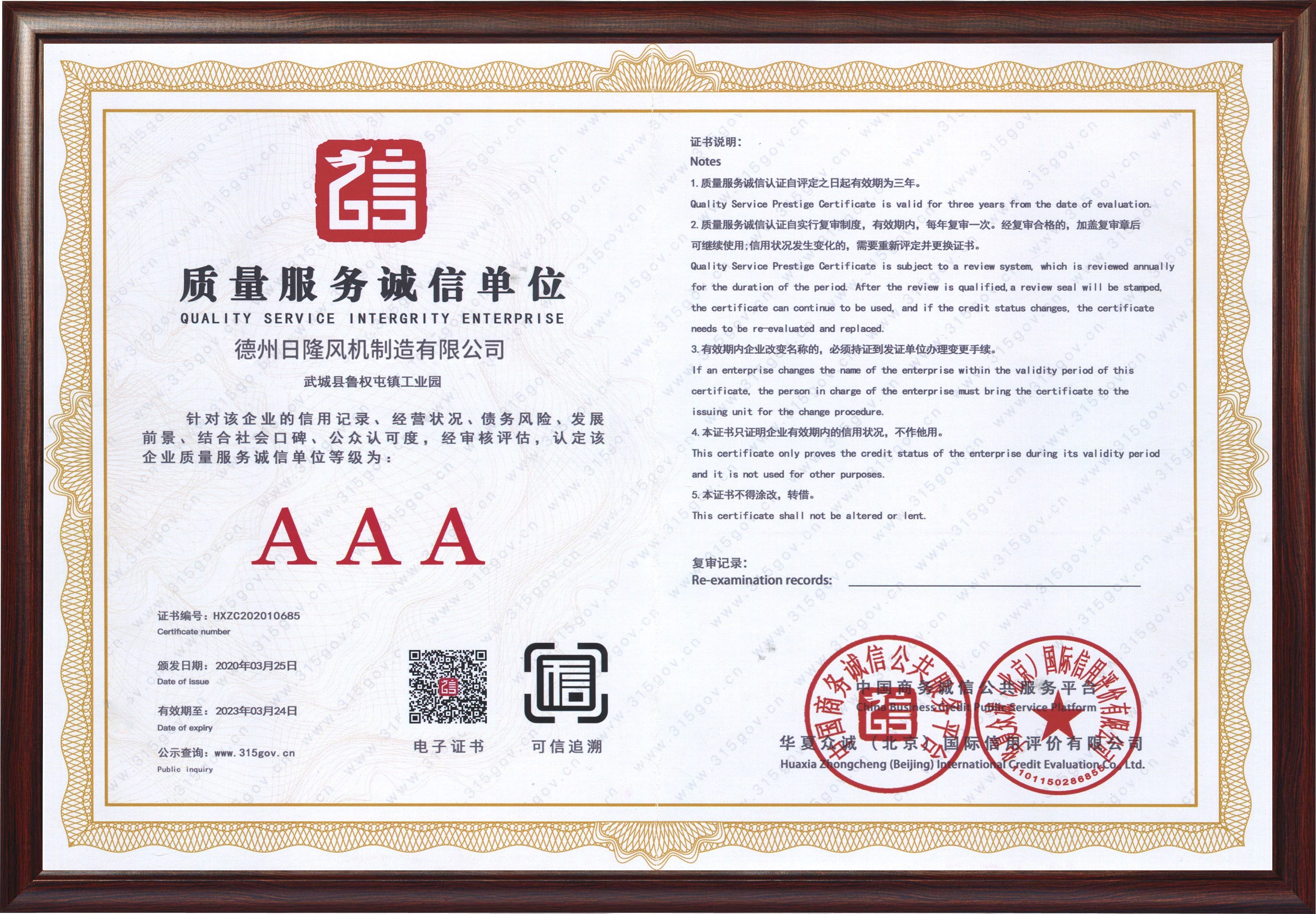 日隆風(fēng)機(jī)資質(zhì) -